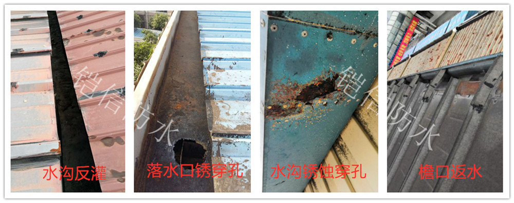 水槽是金属和混凝土建筑结构最容易发生渗漏的地方,落水口四周脱胶、水槽穿孔、锈蚀等都会引起漏水,一般普通防水材料很难满
